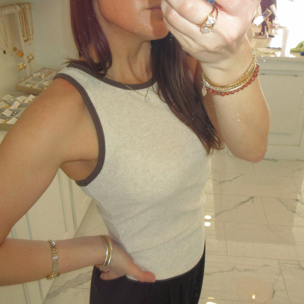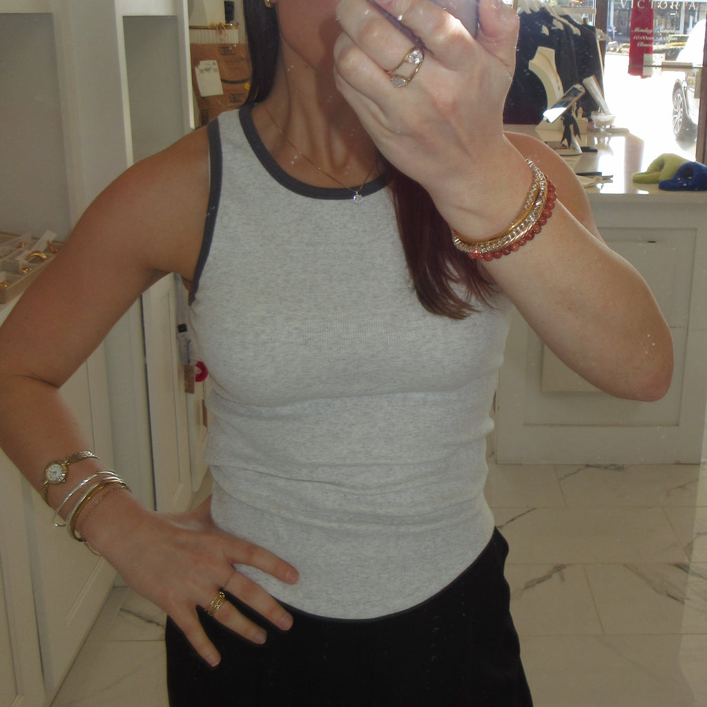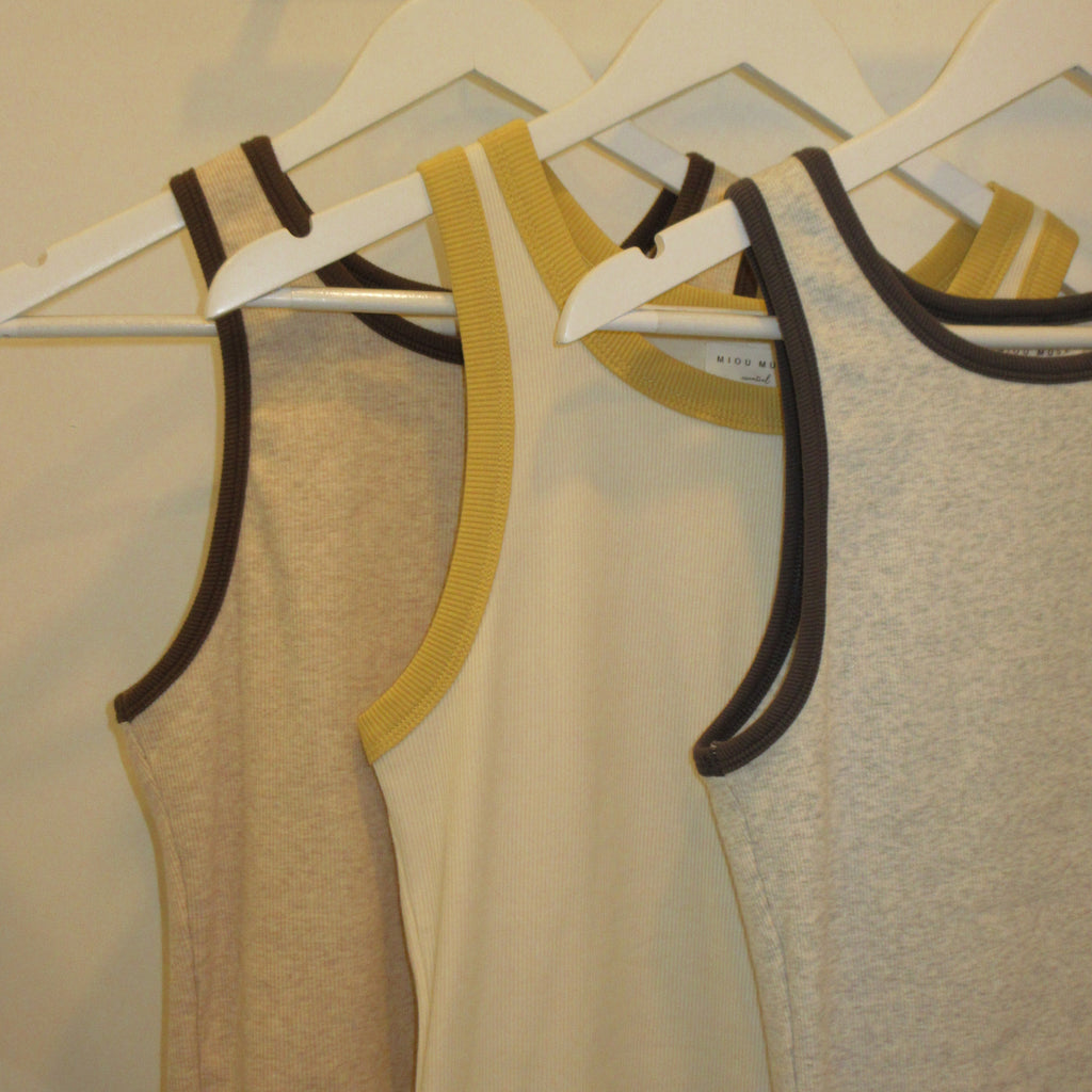 Contrast piping tanks available in grey, yellow, and brown