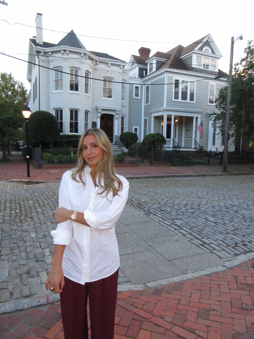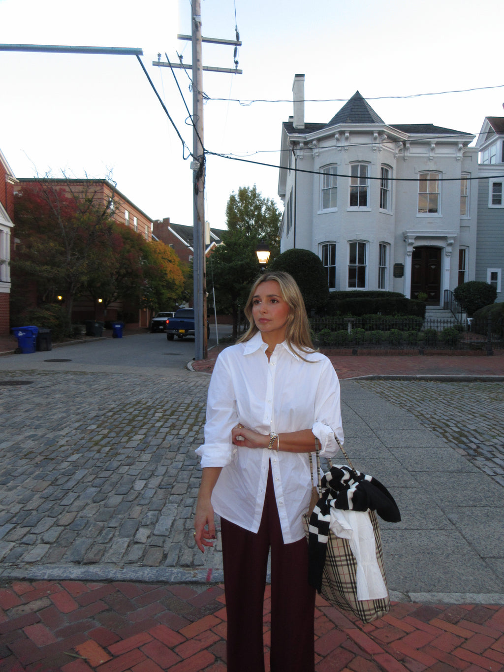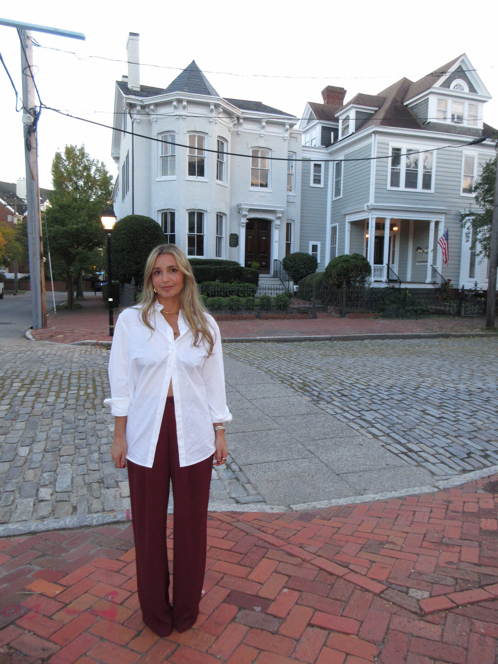 A white button-down is a necessity to everyone's wardrobe. The Poplin has a clean and crisp look to it and goes with everything. This button down is lightweight, yet, thick enough to not be see-through. Pair this top with black high-rise jeans or a pair of denim shorts.
