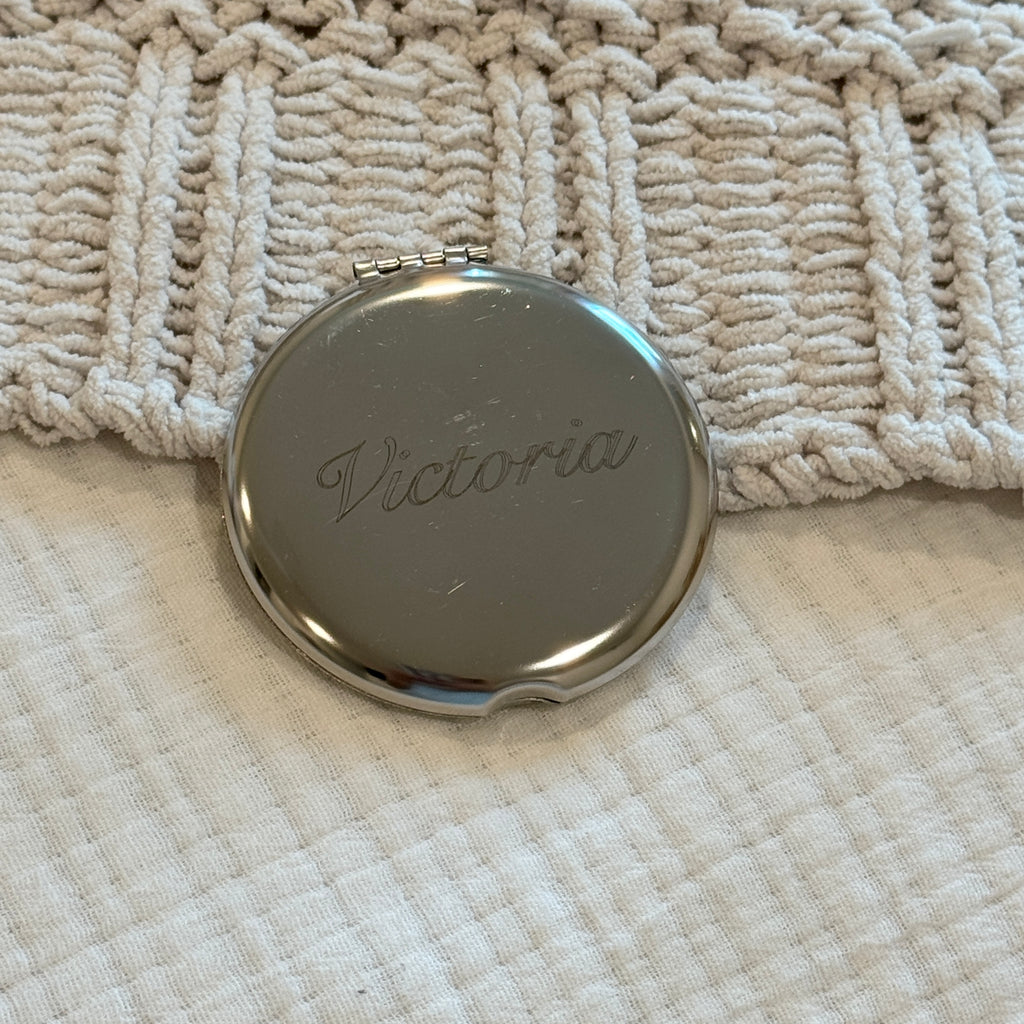 A timeless everyday essential with a personal touch. This sleek compact mirror is perfect for slipping into your bag, with the option to engrave initials, a name, or a meaningful message. A thoughtful gift for bridesmaids, birthdays, or just because—made to be both beautiful and practical.